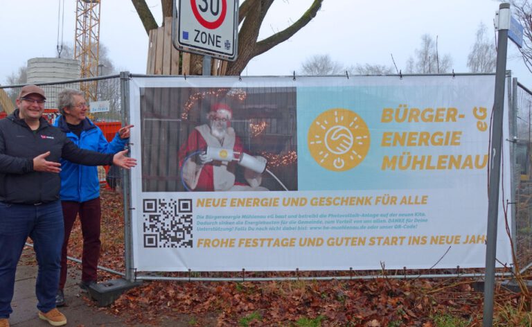 Wer den Mittelweg hochläuft, kann uns ab sofort nicht mehr übersehen. Ein Weihnachtsmann wurde im Moment der Einspeisung fotografisch ertappt. Der Stecker glüht schon, her mit dem Strom. Drei Zeilen Text konzentrieren aufs Wesentliche. QR zeigt auf den Internetauftritt. Unser neues Logo leuchtet.